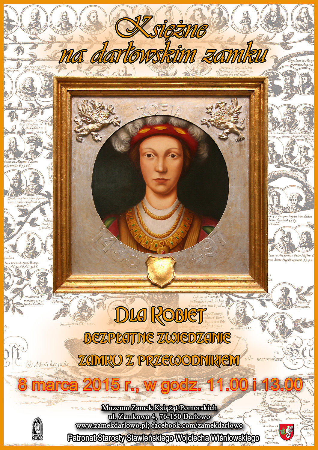 8 marca 2015 roku zapraszamy Panie do zamku na wydarzenie pn. Księżne na darłowskim zamku. Tego dnia o godzinie 11.00 i 13.00 Panie będą mogły bezpłatnie zwiedzić komnaty z przewodnikiem. Zwiedzanie tematycznie związane będzie z historią życia księżnych mieszkających lub przebywających tymczasowo na zamku. Począwszy od Elżbiety Piastówny a kończąc na Elżbiecie Holsztyńskiej dowiemy się kim były, jakie miały pragnienia, pasje oraz w jaki sposób wpłynęły na rozbudowę i estetykę wnętrz zamkowych. Kto wie, Panie, może po zwiedzeniu zamku i poznaniu historii księżnych odkryjecie w sobie cechy księżniczki…?