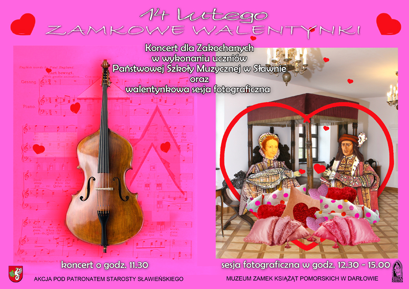 Wszystkich Zakochanych zapraszamy w dniu ich święta do zamku w Darłowie na wydarzenie pn. Zamkowe Walentynki 2015. Tego dnia odbędzie się koncert w wykonaniu uczniów Państwowej Szkoły Muzycznej w Sławnie oraz w specjalnie przygotowanej do tego celu scenografii nasz nadworny fotograf wykona Wam miłosne zdjęcie pamiątkowe. Koncert rozpocznie się o godz. 11.30. Sesja fotograficzna w godz. 12.30 – 15.00. Akcję objął patronatem Starosta Sławieński Wojciech Wiśniowski.